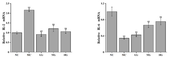 As shown in Figure 2, compared with the NC group, the expression levels of IFN-γ and IL-2 mRNA in the MC group were significantly increased (p < 0.01), while the expression levels of TNF-α, IL-6 and IL-10 mRNA were significantly reduced (p < 0.05). After treatment with JFP-Ps at different doses, the mRNA expression levels of IL-2 and IFN-γ were significantly decreased compared to those in the MC group (p < 0.05), while the mRNA expression levels of TNF-α, IL-6 and IL-10 were significantly increased compared to those in the MC group (p < 0.05). The increased expression of IFN-γ and IL-2 mRNA and the decreased expression of IL-10 mRNA in the MC group indicate that liver tissue may be damaged via inflammation.