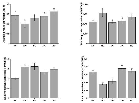 In addition, the mRNA expression levels of p65, p38 and JNK proteins were measured. The results showed that their mRNA expression levels in the MC group were significantly downregulated (p < 0.05) compared with those in the NC group. After the JFP-Ps intervention, the mRNA expression levels were restored compared to those in the MC group (p < 0.05).