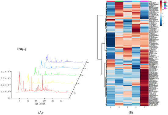 UPLC-Q-TOF-MS was used to collect data from the liver extract (Figure 4). The peak numbers, positions, and intensities of the five different treatment groups showed significant differences, indicating significant changes in the types and quantities of metabolites in the liver samples from different groups. Quality control was conducted on the obtained primary data using t-test (Table 4). A total of 227 substances were found in the positive mode (ESI+) (p < 0.05), while 398 substances were found in the negative mode (ESI−) (p < 0.05). The contents of these substances in the treatment groups were visualized using heat maps.