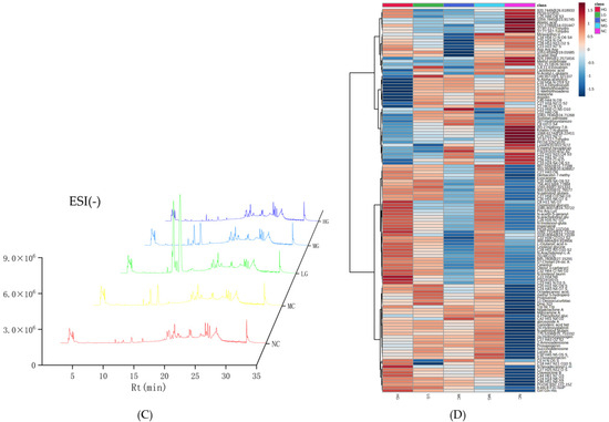 Total Ion Chromatogram (TIC) map and metabolites heatmap in positive (A,B) and negative (C,D) electrospray ionization (ESI) modes. NC: normal control group; MC: model control group; LG: JFP-Ps low-dose group at 50 mg JFP-Ps/kg body weight; MG: JFP-Ps medium-dose group at 100 mg JFP-Ps/kg body weight; HG: JFP-Ps high-dose group at 200 mg JFP-Ps/kg body weight.