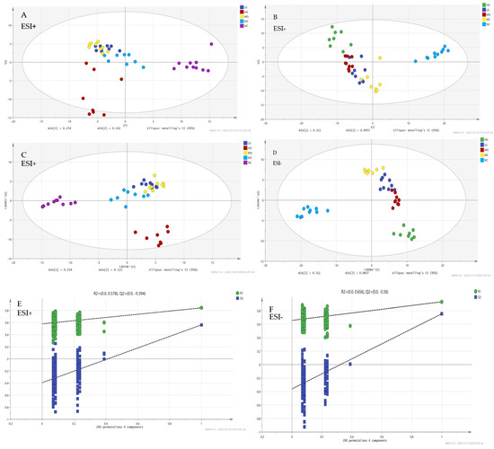 Multivariate statistical analysis ((A,B) PCA score map; (C,D) OPLS-DA score map; (E,F) 200 permutation test).