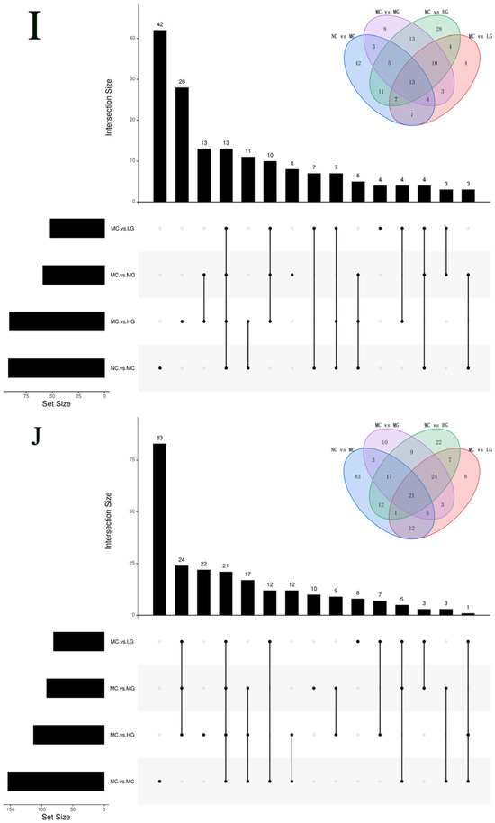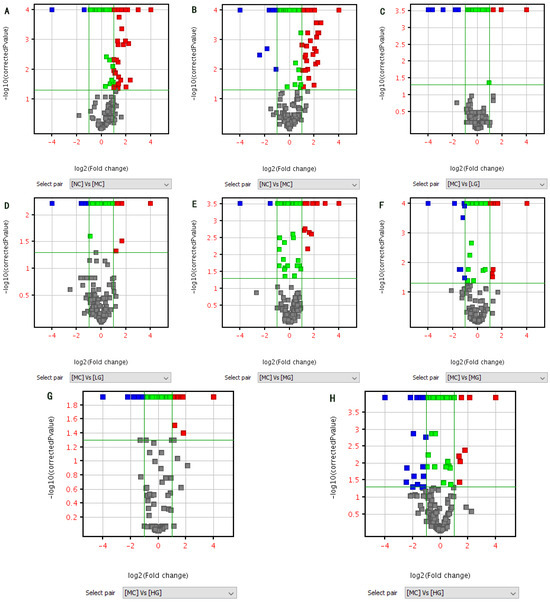 Volcano map ((A): NC vs. MC in ESI+, (B): NC vs. MC in ESI−, (C): MC vs. LG in ESI+, (D): MC vs. LG in ESI−, (E): MC vs. MG in ESI+, (F): MC vs. MG in ESI−, (G): MC vs. HG in ESI+, (H): MC vs. HG in ESI−) and Veen map ((I) ESI+; (J) ESI−). Red: Metabolites which pass both log2 Fold Change > 1.0 and p < 0.05 cut-offs and are up-regulated. Blue: Metabolites which pass both log2 Fold Change < −1.0 and p < 0.05 cut-offs and are down-regulated. Green: Metabolites which pass the p < 0.05 cut-off and fail to pass the |log2 Fold Change| > 1.0 cut-off. Grey: Metabolites which neither pass the p < 0.05 cut-off nor the |log2 Fold Change| > 1.0 cut-off.