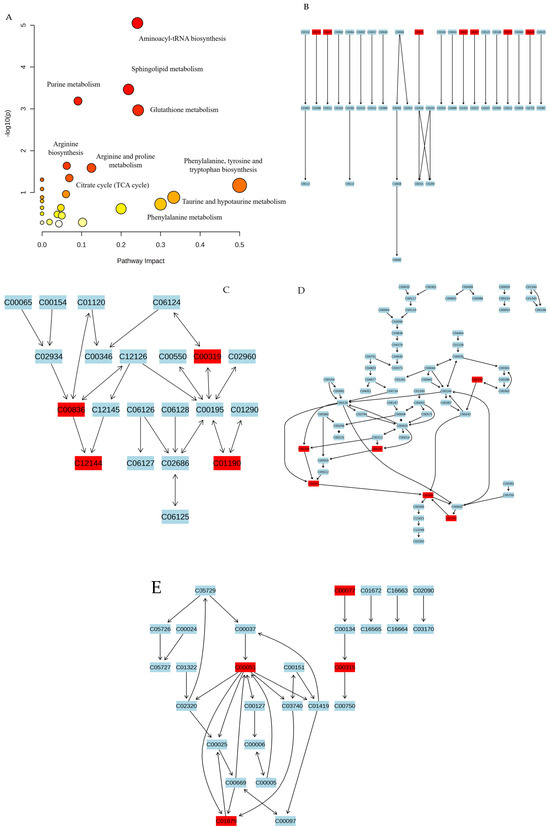 Pathway analysis. (A) metabolic pathway diagram; (B) Aminoacyl-tRNA biosynthesis; (C) Sphingolipid metabolism; (D) Purine metabolism; (E) Glutathione metabolism. The colors from yellow to red represent metabolites with different level of significance, red being more significant and yellow less significant respectively. The compounds highlighted in red font represent the metabolic markers in the metabolic pathways.