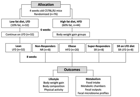 Male 4-week-old C57BL/6J mice were purchased from the Jackson Laboratory (Bar Harbor, ME, USA) and housed four animals per cage under controlled temperature (24 ± 2 °C) and light (12 h light–dark cycle, lights on at 7:00 a.m.) conditions. Immediately upon arrival, animals were allowed to adapt to the new conditions for 7 days, and the animals were handled daily to reduce the stress of physical manipulation. Mice were then randomized based on the initial body weights into ad libitum access to Research Diets (New Brunswick, NJ, USA) low-fat diet (LFD, D12450J, 10 kcal % fat, 3.85 kcal/g, n = 32) or high-fat diet (HFD, D12492, 60 kcal % fat, 5.24 kcal/g, n = 44) for 6 weeks. Obese animals were further randomized based on their body weights into normally obese (HFD), non-responders (NR), super-responders (SR), or super-responders switched back to the low-fat diet (SR-LFD) for an additional 8 weeks (Figure 1). The study was performed as a parallel arm with shared LFD and HFD controls []. All animal experiments were performed according to procedures approved by the NC Research Campus Institutional Animal Care and Use Committee in the David H. Murdock Research Institute (Kannapolis, NC, USA), an AAALAC-accredited animal care facility (protocol No. 12-018, approved on 10 April 2013).