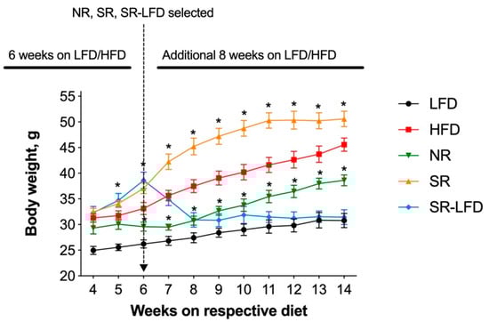 Body weight of lean controls (LFD), obese controls (HFD), obesity-resistant non-responders (NR), obesity-prone super-responders (SR), and super-responders an LFD during the study −14 (SR-LFD). Results are expressed as means ± SEM (n = 8). Data were analyzed using a two-factor repeated-measures ANOVA; * p < 0.05 versus the HFD controls.