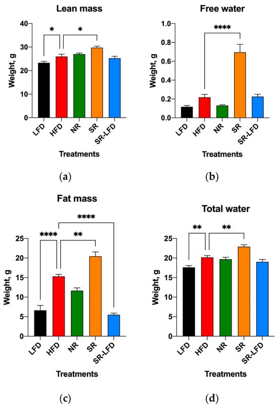 Body weight gains correlated with significant changes in body composition in all groups at the end of the study. As expected, the mean body weights of HFD mice increased by 59.4% relative to the LFD controls, and this increase consisted of a 11.5% increase in lean body mass and a 56.8% increase in fat body mass due to the high-fat nature of the HFD (Figure 4a,c). Similar to HFD mice, NR animals fed an HFD gained 13.6% more lean body weight, despite an only 43.2% increase in fat body mass, indicating changes in the skeletal muscle tissues and reduced development of adipose depots under the same feeding conditions. SR mice gained 21.6% more lean body mass and 67.7% more fat body mass than the LFD controls, corresponding to a 25.2% increase in fat body mass relative to normally obese HFD mice (p < 0.01, Figure 4c). The SR-LFD animals that returned to the LFD showed both lean and fat body masses that returned to the levels of the LFD controls.