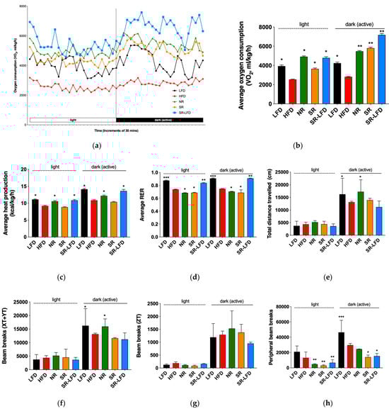 All animal groups fed an HFD showed respiratory exchange ratios (RERs) in the range of 0.685–0.748, indicating that they all relied on dietary fats as primary metabolic fuel. The lowest mean RER value was observed in NR mice during the inactive cycle (0.685 ± 0.022, p < 0.05), suggesting an upregulated lipid metabolism despite relative inactivity at rest (Figure 5d).