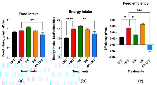 Changes in (a) food intake, (b) energy intake, and (c) feed efficiency among lean controls (LFD), obese controls (HFD), obesity-resistant non-responders (NR), obesity-prone super-responders (SR), and super-responders fed an LFD. Results are expressed as means ± SEM (n = 8). Data were analyzed using one-way ANOVA followed by Dunnett’s multiple comparisons; * p < 0.05, ** p < 0.01, *** p < 0.001, and **** p < 0.00001 versus the HFD controls.