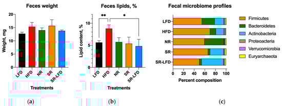 Fecal outputs and microbiome profiles determined at the end of the study among lean controls (LFD), obese controls (HFD), obesity-resistant non-responders (NR), obesity-prone super-responders (SR), and super-responders fed an LFD, including (a) fecal pellet weight, (b) fecal fat content, and (c) microbiome composition at the phylum level. Results are expressed as means ± SEM (n = 8). Data were analyzed using one-way ANOVA followed by Dunnett’s multiple comparisons; * p < 0.05 and ** p < 0.01 versus the HFD controls.