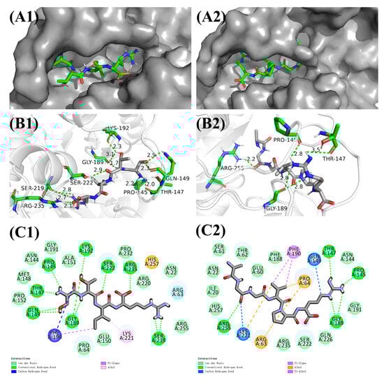 | Ala-Gly-Gly-Val-Pro-Arg | −8.1 | ILE20, ASN22, GLU60, SER61, THR62, ASN144, PHE188, GLY191, SER222, GLN226, ARG235, HIS257 (van der waals); PRO145, THR147, GLY189, ARG255 (Conventional Hydrogen Bond); GLN149, LYS221 (Carbon Hydrogen Bond); PHE190 (Pi-Sigma); ARG63, PRO64 (Alkyl); PHE190 (Pi-Alkyl) |