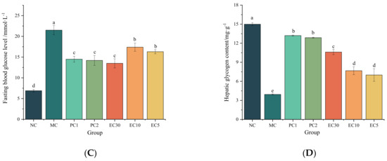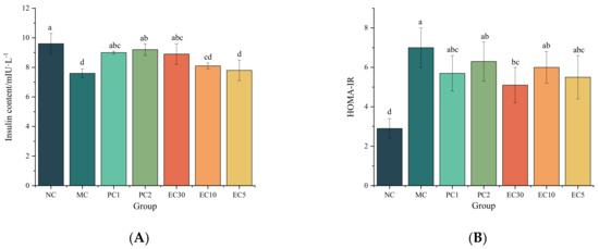As seen in Figure 2A, the insulin contents in the NC group were significantly higher than those in the MC group (p < 0.05), while there was no significant difference in the insulin contents between the NC, PC1, PC2, and EC30 groups (p > 0.05) (Table S3). Moreover, the HOMA-IR levels in the MC group were noticeably higher than those in the NC and EC groups (p < 0.05) (Figure 2B and Table S3).