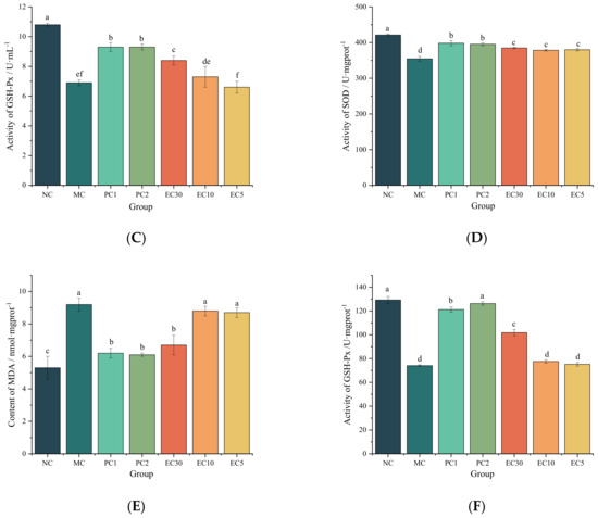 The MDA contents in the MC group were significantly higher than those in the NC group (p < 0.05) in the serums and livers, whereas the activities of SOD and GSH-Px were markedly lower than those in the NC group (p < 0.05) (Figure 4). The activities of SOD and GSH-Px in the PC1, PC2, and EC30 groups were significantly higher than those in the MC group (p < 0.05) (Figure 4A,C,D,F), while the MDA contents in the PC1, PC2, and EC30 groups were notably lower than those in the MC group (p < 0.05) (Figure 4B,E). In particular, the GSH-Px activity in livers and serums rose in a dose-dependent manner with the improvement in epimedin C concentration.