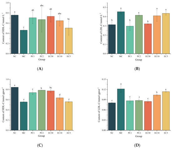 Effects of epimedin C on blood lipid levels. (A) High-density lipoprotein cholesterol (HDL-C) content in serums; (B) low-density lipoprotein cholesterol (LDL-C) content in serums; (C) HDL-C content in livers; (D), LDL-C content in livers. Different letters on the top of columns indicate significant differences between groups (p < 0.05).