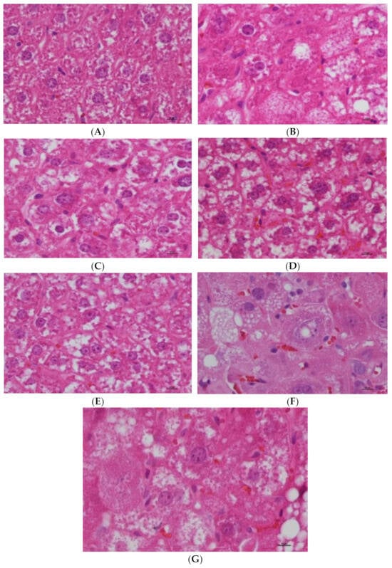 Effects of epimedin C on liver histopathological changes. Structures of liver cells and tissues in the NC group (A), the MC group (B), the PC1 group (C), the PC2 group (D), the EC30 group (E), the EC10 group (F), and the EC5 group (G).