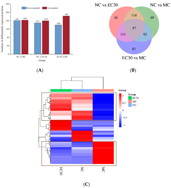 Differentially expressed protein (DEP) analyses in different groups. (A) The numbers of down-regulated and up-regulated DEPs in the NC group vs. the MC group, the NC group vs. the EC30 group, and the EC30 group vs. the MC group. (B) Venn diagram of DEPs in the NC group vs. the MC group, the NC group vs. the EC30 group and the EC30 group vs. the MC group. (C) Hierarchical clustering analysis of DEPs in the NC, MC, and EC30 groups.