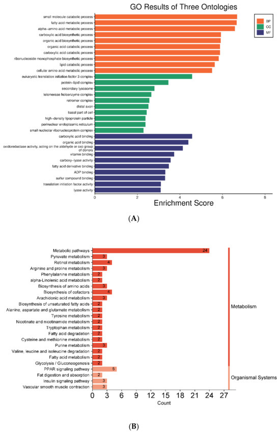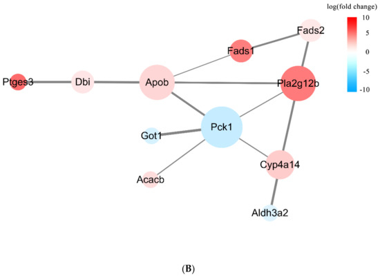 The GO and KEGG pathway assays involving 92 key DEPs are presented as histograms (Figure 8). According to the GO analysis, several proteins were intimately linked to GO functions such as CC, MF, and BP (Table S4). These functional proteins included acetyl-CoA carboxylase 2 (Acacb), diazepam-binding inhibitor (Dbi), cytochrome P450 4A14 (Cyp4a14), threonine synthase-like 2 (Thnsl2), peroxisomal acyl-coenzyme A oxidase 2 (Acox2), glutamate oxaloacetate transaminase 1 (Got1), methionine adenosyltransferase 1 alpha (Mat1a), cytosolic phosphoenolpyruvate carboxykinase (Pck1), etc. (Table S3 and Figure S4). Regarding CC, DEPs were mainly related to protein–lipid complexes, secondary lysosomes, high-density lipoprotein particles, and the perinuclear endoplasmic reticulum, most of which contributed to lipid anabolism (Figure 8A). Regarding MF, DEPs were mainly correlated with carboxylic acid binding, organic acid binding, fatty acid derivative binding, oxidoreductase activity, and carboxy-lyase activity. Regarding BP, DEPs took part in fatty acid metabolism, carboxylic acid and organic acid anabolism or catabolism, and lipid catabolism (Figure 8A). According to the KEGG pathway analysis, 24 pathways were enriched (Figure 8B). Among them, seven pathways were directly involved in the metabolisms of fatty acids and their derivatives, namely, the peroxisome proliferator-activated receptor (PPAR) signaling pathway, arachidonic acid metabolism, fatty acid metabolism, α-linolenic acid metabolism, unsaturated fatty acid biosynthesis, fatty acid degradation, and fat digestion and absorption (Figure 8B). In contrast, one pathway (i.e., pyruvate metabolic pathway) was indirectly related to fatty acid anabolism through the synthesis of intermediates (acetyl CoA). There were 10 DEPs annotated in KEGG pathways directly related to fatty acid metabolism, including Dbi, Cyp4a14, Acox2, Pck1, fatty acid desaturase 1 (Fads1), fatty acid desaturase 2 (Fads2), group XIIB secretory phospholipase A2-like protein (Pla2g12b), apolipoprotein B-100 (Apob), prostaglandin E synthase 3 (Ptges3), and aldehyde dehydrogenase family 3 member A2 (Aldh3a2). To sum up, a total of 14 proteins were identified with the GO and KEGG pathway analyses.