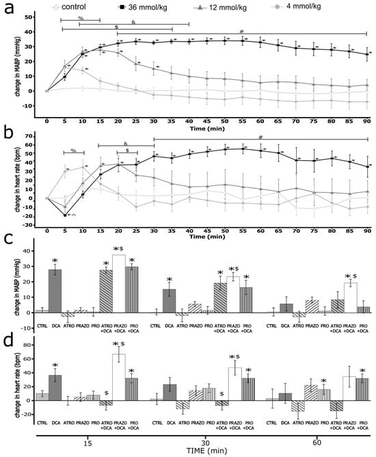Changes in hemodynamic parameters in Sprague–Dawley rats after the intravenous administration (IV) of either a vehicle (0.9% NaCl) or deoxycholic acid (DCA) at a dose of 4, 12, and 36 mmol/kg. (a) Change in mean arterial blood pressure (ΔMABP, mmHg); * p < 0.05 vs. baseline, % p < 0.05: 4 mmol/kg DCA series vs. the vehicle, $ p < 0.05: 12 mmol/kg DCA series vs. the vehicle, & p < 0.05: 12 mmol/kg vs. 4 mmol/kg DCA series, # p < 0.05: 36 mmol/kg DCA series vs. 4 mmol/kg, 12 mmol/kg DCA series and the vehicle. (b) Change in heart rate (ΔHR, beats/min); * p < 0.05 vs. baseline, % p < 0.05: 4 mmol/kg vs. 12 and 36 mmol/kg DCA series and the vehicle, & p < 0.05: 12 mmol/kg vs. 4 mmol/kg DCA series and the vehicle, $ p < 0.05: 36 mmol/kg DCA series vs. the vehicle # p < 0.05: 36 mmol/kg DCA series vs. 4, 12 mmol/kg DCA series and the vehicle, ^ p < 0.05: 36 mmol/kg DCA vs. 4 mmol/kg series and the vehicle. (c) ΔMABP and (d) ΔHR after the intravenous infusions of DCA at a dose of 12 mmol/kg, or atropine (ATRO), prazosin (PRAZO), propranolol (PRO), the vehicle (CTRL), DCA after pretreatment with either atropine, prazosin, or propranolol (DCA + ATRO, DCA + PRAZO, DCA + PRO). * p < 0.05 vs. baseline, $ p < 0.05 vs. DCA series. Means ± SE are presented.