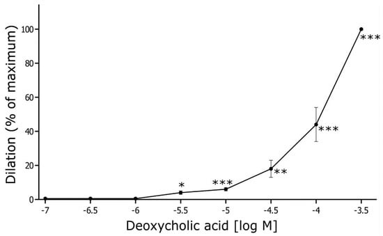DCA-induced vascular relaxation in rat mesenteric artery. Mesenteric arteries were pre-contracted by phenylephrine (PE, 1 μM) and various concentrations of deoxycholic acid (from 0.1 µM up to 500 µM, n = 6) were applied extravascularly. Dilation is expressed as a percentage of maximum diameter. Means ± SE of n arteries are presented. * p < 0.05; ** p < 0.01; *** p < 0.001: significant vasorelaxation.
