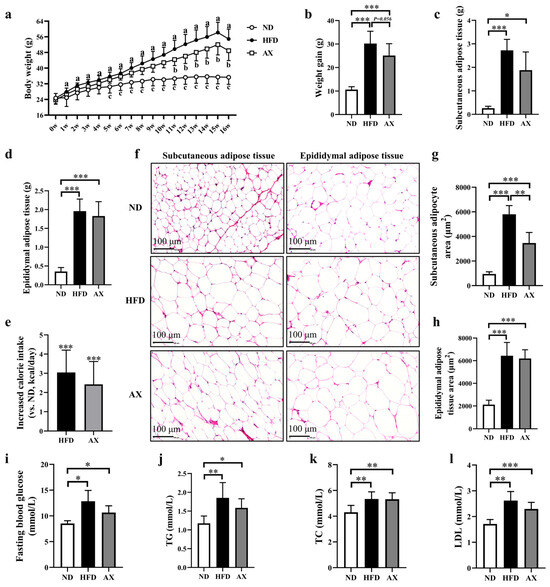 The effects of AX supplementation on body weight, body fat, and glucolipid levels of obese MDX mice. (a) Growth curves of the body weight. (b) Final weight gain. (c) Subcutaneous fat masses. (d) Epididymal fat masses. (e) Analysis of calorie intake compared with the HFD group. (f) H&E staining of adipose tissue. Scale bar: 100 μm. (g) Analysis of subcutaneous adipocyte area. (h) Analysis of epididymal adipocyte area. (i) Fasting blood glucose levels. (j) TG levels. (k) TC levels. (l) LDL levels. HFD vs. ND, a p < 0.05; HFD vs. AX, b p < 0.05; AX vs. ND, c p < 0.05; * p < 0.05; ** p < 0.01; *** p < 0.001.