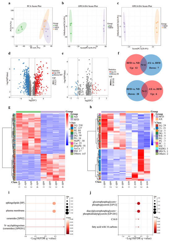 The effects of AX supplementation on lipidomics. Analysis of the PCA plot (a); OPLS-DA scores plot (b,c) and volcano plot (d,e) analysis of HFD vs. ND and AX vs. HFD, respectively. In volcano plots, significantly differential lipid species were shown as a red (up) or blue (down) dot, while a grey dot represented no significant difference of lipids; Venn plot (f) and cluster heatmap (g,h) analysis of significantly differential lipids in HFD vs. ND and AX vs. HFD; LION lipid functional enrichment analysis of shared significantly differential lipids between HFD vs. ND and AX vs. HFD: (i) shared significantly differential lipids up-regulated in HFD vs. ND and down-regulated in AX vs. HFD, and (j) shared significantly differential lipids up-regulated in AX vs. HFD and down-regulated in HFD vs. ND. AcCa, Acyl Carnitine; Cer, Ceramides; CL, Cardiolipin; DG, Diglyceride; dMePE, Dimethylphosphatidylethanolamine; MePC, Methylatedphosphatidylcholine; MLCL, Monolysocardiolipin; PC, Phosphatidylcholine; PE, Phosphatidylethanolamine; PG, Phosphatidylglycerol; PS, Phosphatidylserine; SM, Sphingomyelin; SQDG, Sulfoquinovosyldiacylglycerol; TG, Triglyceride; WE, Wax ester.