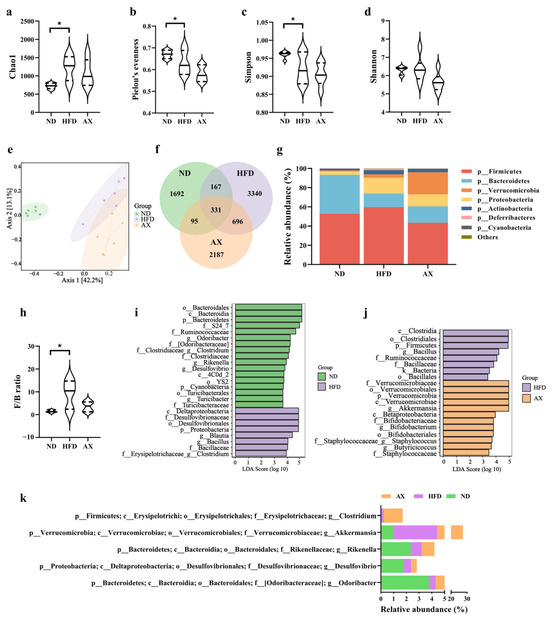 The effects of AX supplementation on gut microbiota of obese MDX mice. Alpha diversity includes (a) Chao 1, (b) Pielou evenness, (c) Simpson index, and (d) Shannon index. (e) Bray–Curtis based PCoA plot. (f) Venn diagram. (g) Gut microbiota composition at the phylum level. (h) F/B ratio. LDA scores of LEfSE analysis: (i) ND vs. HFD and (j) HFD vs. AX. (k) Differential bacteria at the genus level with average abundance ≥1. * p < 0.05.