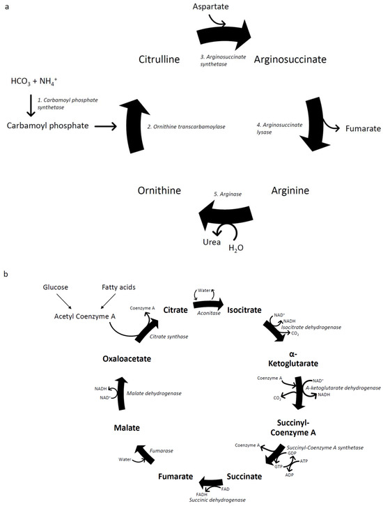 The urea cycle and the tricarboxylic acid cycle. (a) Flowchart describing the steps of the urea cycle; (b) flowchart describing the steps of the tricarboxylic acid cycle.