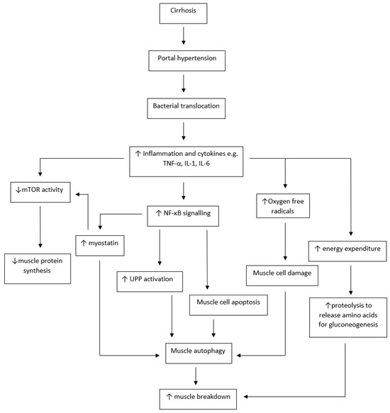 Ammonia also acts to directly upregulate myostatin expression in muscle, which acts as a negative regulator of muscle cell growth and proliferation through the inhibition of intracellular signalling via the mammalian target of the rapamycin (mTOR) pathway [52,56]. This results in reduced skeletal muscle protein synthesis and further contributes to the impairment in ammonia clearance, due to reduced TCA cycle activity related to the reduction in muscle mass, and therefore a self-perpetuating cycle of muscle depletion.
