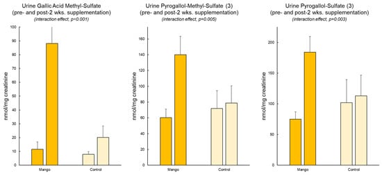 Twelve putative gallotannin-derived metabolites were identified in the urine of subjects who consumed mango (Table 3). Three of these metabolites differed significantly between the mango and water-only (control) trials (Figure 1). These included O-methylgallic acid-O-sulfate (quantified against a syringic acid standard, interaction effect, p < 0.001), O-methylpyrogallol-O-sulfate (quantified against a syringic acid standard, p = 0.005), and pyrogallol-O-sulfate (quantified against a protocatechuic acid standard, p = 0.003).