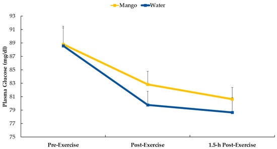 Study participants who were randomized to mango ingestion consumed 165 g (~25 g carbohydrate) with water just before the 2.25 h cycling bout. Figure 2 shows that plasma glucose decreased following the cycling bouts for both supplements (mango and water-only) (p < 0.001) with no difference in the pattern of change (interaction effect, p = 0.543).