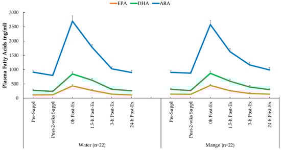 Plasma concentrations for ARA, EPA, and DHA increased significantly in response to the 2.25 h exercise bouts (all time effects, p < 0.001), but the pattern of change over time (interaction effects) was not significant (p values = 0.412, 0.380, and 0.740, respectively) (Figure 3).