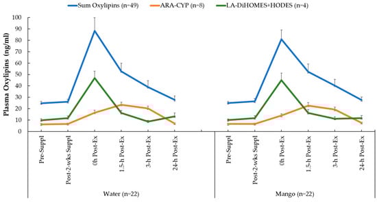 Oxylipin generation is a highly controlled process that is sensitive to both nutrition- and exercise-based interventions [51,52]. More than 50 enzymes are involved in producing oxylipins, and signaling is conducted by binding to a variety of receptors or by interacting with intracellular pathways [52,53,54]. The enzymes that regulate oxylipin production and the receptors to which they bind are potential targets for metabolites derived from dietary macronutrients and polyphenols [9,10,11,12,13,14,54]. Underlying mechanisms, however, are poorly understood, with large scientific gaps regarding the linkage between dietary change and oxylipin generation. In previous studies, our research group has discovered that the increase in ARA-CYP- and LA-DiHOMES + HODES-derived oxylipins were strongly mitigated when cyclists consumed carbohydrates (both 6% carbohydrate sports beverages and bananas) before, during, and after prolonged and intensive cycling bouts [5,29]. Carbohydrate supplementation may influence CYP activity within an exercise stress context by mitigating changes in plasma concentrations of glucose, insulin, and IL-6 [5,29]. In the current study, pre-cycling mango-carbohydrate intake (about 25 g) was insufficient to significantly alter plasma glucose levels (Figure 2).