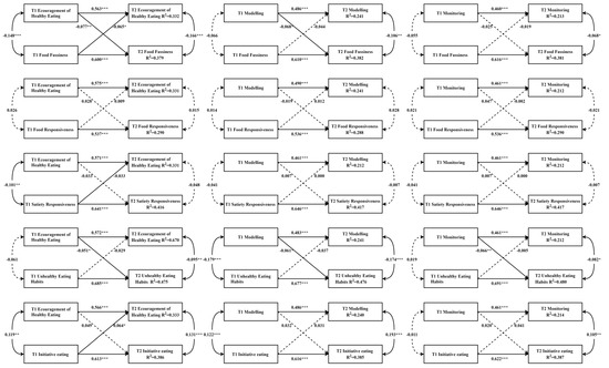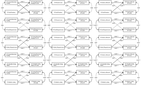 Additionally, the cross-sectional and longitudinal correlations between feeding practices and CEBs were not strong, and more than two-thirds of longitudinal associations showed no statistical significance. In our study, some covariates (e.g., child temperament and parental concern about child weight) had close links to CEBs, which may weaken the relationships between PFPs and CEBs. For example, a quasi-experimental study (n = 37) found that preschool children with a lower level of inhibition control showed a greater increase in restricted food intake in response to parental restrictive feeding. In contrast, children with a higher level of inhibition control showed no significant changes [49]. It seems that the children’s temperaments played an important role in these relationships, which might influence the estimates of paths if not added as covariates. In addition, we used cross-lagged analyses to explore the bidirectional associations between specific feeding practices and eating behaviors, whereas CEBs were influenced by a combination of food-related parenting practices in real time [15,51]. This may be one of the reasons that we found non-significant associations in most models. Future studies should consider the combined effects of PFPs and CEBs on each other.