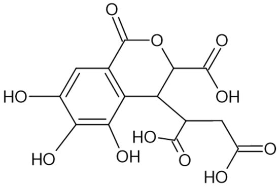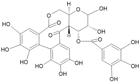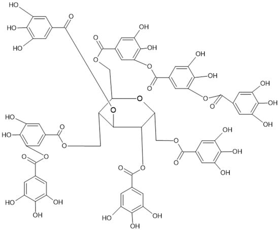 The hydrolyzable tannins (HTs) are hydrolyzed by acids into glucose and ellagic acid or into glucose and gallic acid (GA). The HT group includes ellagitannins (ETs) (Figure 2) and gallotannins (Figure 3).