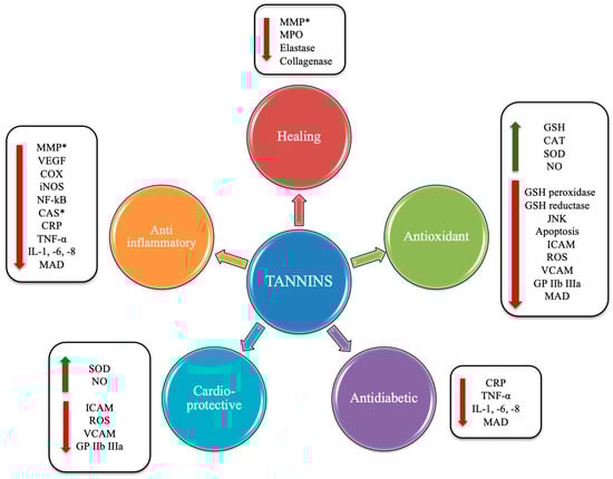 Potential beneficial effects induced by tannins. Abbreviations: *, antioxidant capacity; VEGF, vascular endothelial growth factor; MMP, matrix metalloproteinase; COX, cyclooxygenase; iNOS, inducible nitric oxide synthase; NF-κB, nuclear factor kappa-light-chain-enhancer of activated B cells; CAS, caspase; CRP, C-reactive protein; TNF-α, tumor necrosis factor-α; IL, interleukin; MAD, malondialdehyde; GP IIb IIIa, glycoprotein IIb/IIIa; NO, nitric oxide; VCAM, vascular cell adhesion protein; ROS, reactive oxygen species; ICAM, intercellular adhesion molecule; SOD, superoxide dismutase; CAT, catalase; JNK, C-Jun N-terminal kinase.