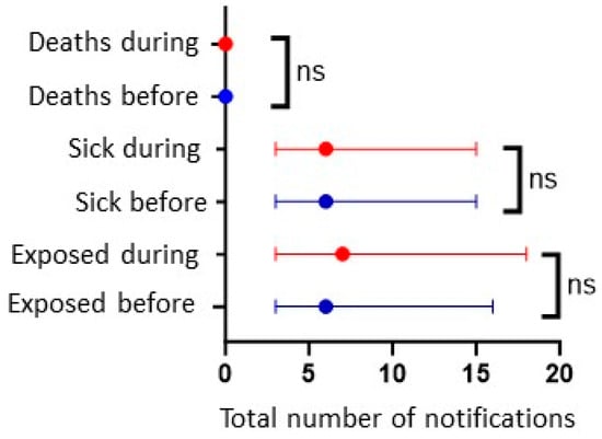 The median number of sick people before and during the COVID-19 pandemic was six and seven, respectively, with no recorded deaths. In addition, the only difference shown was between those exposed in the two periods. However, this difference was not significant (Figure 1).
