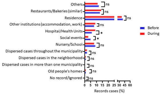 Analyzing the events of FBD contaminations, there was no significant difference in the number of notifications before and during the pandemic. However, there was a significant difference in where the outbreak occurred, with a reduction in cases at social events (p = 0.014) and an increase in notifications at hospitals and health units (p = 0.031) when the two periods were compared, as seen in Figure 2.