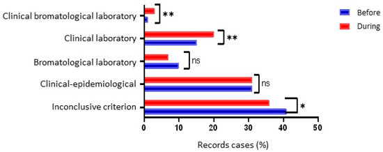 Figure 3 shows a significant difference between the two periods (before and during the pandemic) for the type of test/criteria used to confirm FBD outbreaks. There was a significant increase in the use of clinical laboratory tests (p = 0.005) and bromatological clinical laboratory tests (p = 0.001), as well as a significant reduction in ignored, inconclusive, or unrecorded cases (p = 0.025).