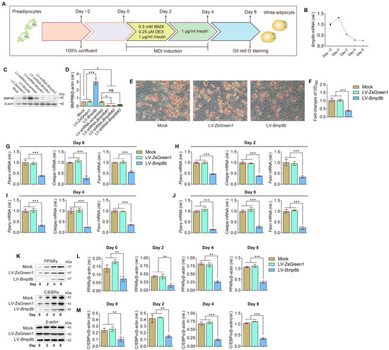 Overexpressing BMP8B inhibits adipocyte differentiation. (A) 3T3-L1 preadipocyte differentiation protocol. (B) The expression pattern of Bmp8b during adipogenesis. (C,D) Effective increased and inhibited Bmp8b expression in 3T3-L1 adipocytes. (E) On Day 8, Oil Red O staining revealed lipid contents in cells (Mock, LV-ZsGreen1, and LV-Bmp8b). (F). Quantification of lipid content in cells after adipogenic differentiation (Day 8). (G–J) qRT-PCR analyses of the expression of adipogenic marker genes (Cebpα, Pparγ, and Fasn) on Day 0 (G), Day 2 (H), Day 4 (I), and Day 8 (J). (K–M) Protein levels of PPARγ (L) and C/EBPα (M) detected through immunoblotting. β-actin was used as a loading control. ImageJ software was used to quantify protein levels. Scale bar = 20 µm. The symbols in the charts represent three biological replicates. The data were presented as mean ± SD and analyzed using one-way ANOVA (ns not significant, * p < 0.05, ** p < 0.01, *** p < 0.001).
