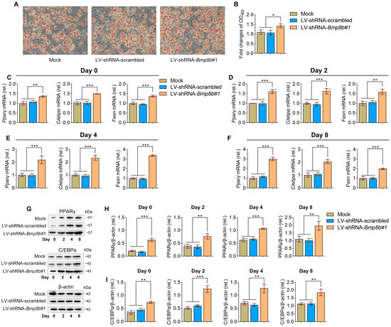Knockdown BMP8B promotes adipogenesis. (A) On Day 8, Oil Red O staining revealed lipid contents (Mock, LV-shRNA-scrambled, and LV-shRNA-Bmp8b#1). (B) Quantification of lipid content in cells after adipogenic differentiation (Day 8). (C–F) qRT-PCR analyses of the expression of adipogenic marker genes (Cebpα, Pparγ, and Fasn) on Day 0 (C), Day 2 (D), Day 4 (E), and Day 8 (F). (G–I) On the day after induction, the protein levels of PPARγ (H) and C/EBPα (I) were detected through immunoblotting. Scale bar = 20 µm. The symbols in the charts represent three biological replicates. The data were presented as mean ± SD and analyzed using one-way ANOVA (* p < 0.05, ** p < 0.01, *** p < 0.001).