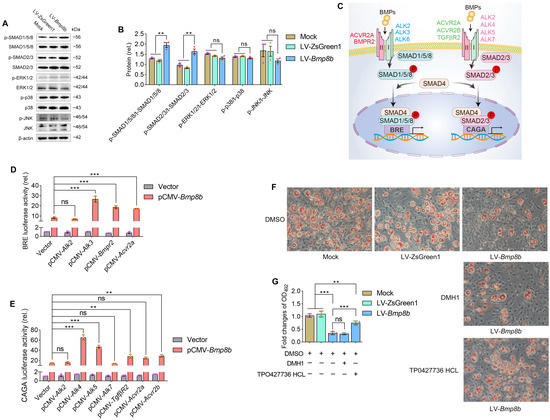 BMP8B triggers SMAD2/3 signaling to suppress adipogenesis. (A,B) Analysis using immunoblotting and quantification was conducted to assess the protein levels of p-SMAD1/5/8, p-SMAD2/3, p-ERK1/2, p-p38 MAPK, and p-JNK in LV-Bmp8b. (C) A model of BMPs-associated signal transduction. (D) Quantification was performed to determine the luciferase reporter activity driven by BRE, which pCMV-Bmp8b cotransfected with pCMV-Alk2, pCMV-Alk3, pCMV-Bmpr2, pCMV-Acrv2a, respectively. (E) Quantification was performed to determine the luciferase reporter activity driven by CAGA, which pCMV-Bmp8b cotransfected with pCMV-Alk2, pCMV-Alk4, pCMV-Alk5, pCMV-Alk7, pCMV-Tgfβr2, pCMV-Acrv2a, and pCMV-Acrv2b, respectively. (F,G) In the presence of DMH1 or TP0427736 HCL, the cells were induced to differentiate into adipocytes. On Day 8, Oil Red O staining was performed (F). Quantification of lipid content after adipogenic differentiation (G). Scale bar = 20 µm. The symbols in the charts represent three biological replicates. The data were presented as mean ± SD and analyzed using one-way ANOVA (ns not significant, ** p < 0.01, *** p < 0.001).