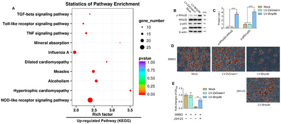 BMP8B triggers NF-κB signaling to suppress adipogenesis. (A) The upregulated KEGG pathway in LV-Bmp8b vs LV-ZsGreen1. (B,C) Western blots and quantification of p-IKKα/β and p-p65 in Mock, LV-ZsGreen1, and LV-Bmp8b. (D,E) Representative photographs of Oil Red O staining were taken to visualize lipids in LV-Bmp8b exposed to JSH-23 with DMSO as a vehicle. The staining intensity was quantified by measuring the optical density at OD492. Scale bar = 20 µm. The symbols in the charts represent three biological replicates. Mean ± SD was used to present the data, which were analyzed using one-way ANOVA (** p < 0.01, *** p < 0.001).