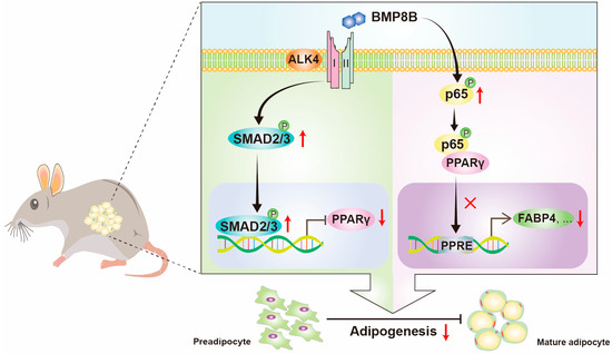 The BMPs are a highly conserved group of signaling molecules that are secreted outside of cells and belong to the TGF-β superfamily. There are two Bmp8 genes in Mus musculus, Bmp8a and Bmp8b [28]. BMP8A is enriched in WAT. We have demonstrated that BMP8A inhibits adipocyte differentiation [30]. BMP8B is enriched in BAT, and it plays an indispensable role in the regulation of thermogenesis in BAT [33]. However, BMP8B exhibits low expression in WAT, meaning little research focuses on its role in white adipocyte differentiation. This study demonstrated that BMP8B hampers adipocyte differentiation by activating the SMAD2/3 and NF-κB pathways, thereby enhancing the knowledge concerning BMP molecules’ functions.