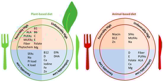 Characteristics of nutrients and components in plant-based vs. animal-based diets. Abbreviations: ALA, α-linolenic acid; B1, vitamin B1; B6, vitamin B6; B12, vitamin B12, Ca, calcium; D, vitamin D; DHA, docosahexaenoic acid; EPA, eicosapentaenoic acid; Fe, iron; K, potassium; Mg, magnesium; MUFAs, monounsaturated fatty acids; phytochem, phytochemicals; Pi, phosphorus; PUFAs, total polyunsaturated fatty acids; SFAs, saturated fatty acids; Zn, zinc.