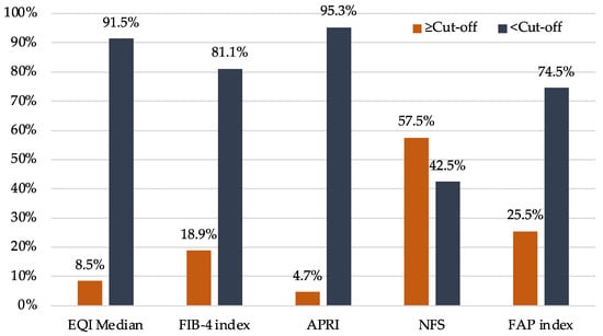 Distribution of scores across different non-invasive screening tools to assess liver fibrosis. APRI: AST (aspartate aminotransferase)-to-platelet ratio index; EQI: ElastQ Imaging; FAP: fibroblast activation protein; FIB-4: Fibrosis-4; NFS: NAFLD (non-alcoholic fatty liver disease) fibrosis score.