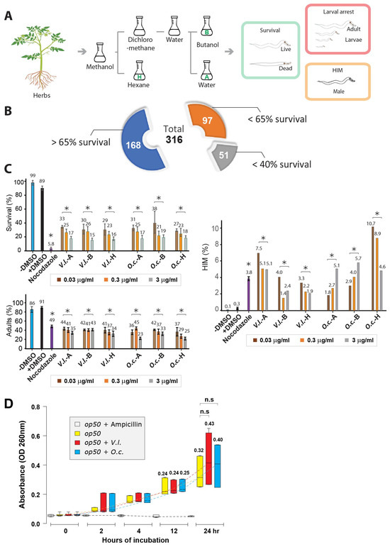 Herb extracts have an inhibitory effect on worm survival and development but do not affect bacterial growth. (A) Experimental workflow depicting the process of extracting compounds from herbs. The extracted compounds were then subjected to a phenotypic analysis, using the C. elegans model system. A 1 kg sample of the air-dried whole plant of each plant was milled to a coarse powder and extracted with methanol (3 × 6 L). The pooled methanol extract was concentrated in vacuo to afford a tarry residue. The methanol extract was dissolved in 90% (aqueous) methanol and extracted with n-hexane. The residual hydroalcoholic phase was freed of the solvent in vacuo, suspended in water, and then sequentially extracted with dichloromethane and n-butanol (n-BuOH) to afford a gross separation into hexane-, dichloromethane-, butanol-, and water-soluble fractions. Three solvents, i.e., hexane, butanol, and water, were designated -H, -B, and -A, respectively. The herbal extracts used in the screening process are listed in Supplementary Table S1. (B) The impact of plant extracts on C. elegans survival and development overview. A total of 316 (168 + 97 + 51) extracts were tested, revealing significant nematocidal effects. Survival (%), adult (%), and HIM (%) of C. elegans were monitored after a 24 h treatment of herb extract and monitored for 48 h. (C) Dose-dependent effects of herb extracts on survival, adult formation, and HIM phenotype. Investigation into the dose-dependent relationship between herbal extract concentrations and C. elegans phenotypes. (Top, middle) Survival rates and adult formation were inversely correlated with increasing herbal extract doses. Dose–response trends were consistent across extracts from different solvents (-A, -B, and -H). (Bottom) Induction of the HIM phenotype in response to herb extracts. V.l. and O.c. extracts were treated at a final concentration of 0.03, 0.3, and 3 µg/mL. The p-values were determined by the two-tailed Mann–Whitney test. Statistical significance between +DMSO and the samples is indicated by asterisks, using the two-tailed t-test. (D) Evaluation of herb extracts’ impact on bacterial growth. Analysis over 24 h revealed no significant bacterial growth defect, suggesting that the nematocidal effects were not primarily attributed to compromised bacterial growth. V.I and O.c were added to a final concentration of 0.03 μg/mL. Asterisks indicate statistically significant.