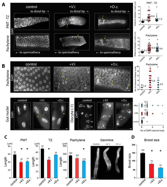 Consistently, we observed a reduction in the length of the PMT, which is occupied by mitotic nuclei, in V. lobelianum and O. cornuta compared to the control groups (Figure 2C). The length decreased by 34% (59 vs. 39 µm for the control and +V.l., p = 0.0017; 59 vs. 41 µm for the control and +O.c., p = 0.0021, determined by a two-tailed t-test). Similarly, V. lobelianum and O. cornuta led to a decrease in the length of the TZ or pachytene stages, where meiotic progression occurs (45 vs. 28 in the control and +V.l., p = 0.0003; 45 vs. 36 in the control and +O.c., p = 0.076; 280 vs. 244 in the control and +V.l., p = 0.076; 280 vs. 215 in the control and +O.c., p = 0.0004, as determined by the two-tailed Mann–Whitney test).