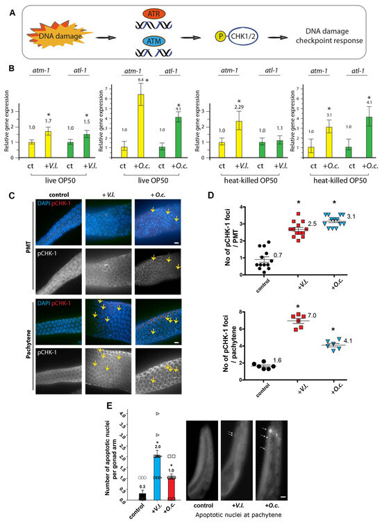 Exposure to herbal extracts of V. lobelianum and O. cornuta activates the DNA damage response pathway in C. elegans, resulting in increased levels of key DNA damage checkpoint components and phosphorylated CHK-1. (A) ATM and ATR kinases collaboratively regulate downstream CHK-1 processes in the intricate DNA damage response pathway, playing essential roles in DNA damage repair. (B) Exposure to herbal extracts leads to the increased expression of ATM-1 and ATL-1, validating the activation of the DNA damage response pathway. Gene expression levels between live and autoclaved OP50 were comparable, indicating that the nematocidal effects attributed to the herbal extracts may not be influenced by bacterial metabolism. Asterisks indicate statistical significance according to the two-tailed Mann–Whitney test. (C) Elevated pCHK-1 foci observed in germlines underscore the active DNA damage response following exposure to herbal extracts, confirming checkpoint activation. Bar = 2 µm. (D) Quantification of the number of pCHK-1 foci presented in (C). Asterisks indicate statistical significance according to the two-tailed Mann–Whitney test. (E) The pachytene stage revealed an increased level of apoptosis, suggesting that unrepaired DNA damage triggers checkpoint activation and subsequent apoptosis in the germline. V.I. and O.c. were added to a final concentration of 0.03 μg/mL. Asterisks indicate statistical significance according to the two-tailed Mann–Whitney test. Bar = 20 µm.