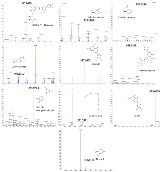 The identification of compounds was conducted through an LC–MS analysis by Yanbotimes (Beijing, China). The LC–MS/MS method used in this study employed a Shimadzu LC-30A chromatography system with a C18 column (2.2 μm, 2.1 × 100 mm). The column temperature was maintained at 40 °C, and the flow rate was set at 0.2 mL/min. A 2 μL sample was injected into the column. The mobile phase consisted of acetonitrile and 0.1% formic acid solution. The mass spectrometry instrument used was the AB Sciex Triple TOF 5600+. For the positive ionization mode, the ion source voltage was 5500 V, and the ion source temperature was set to 500 °C. The declustering potential (DP) was set at 100 V, collision energy (CE) at 40 eV, and collision energy spread (CES) at 15 eV. Nitrogen gas was used as the nebulizing gas, with 50 PSI for both auxiliary gases 1 and 2 and 40 PSI for the curtain gas. The mass spectrometer performed first-level MS scanning in the range of 100–1500 m/z, followed by second-level MS scanning for peaks with a response greater than 100 cps. The range for second-level MS scanning was also set at 100–1500 m/z, and dynamic background subtraction (DBS) was enabled. For the negative ionization mode, the ion source voltage was set at −4500 V, and all other parameters remained the same as in the positive ionization mode. To ensure accuracy, results were compared with the company’s standard sample database. All compounds presented in Table 1 were identified using this rigorous process.