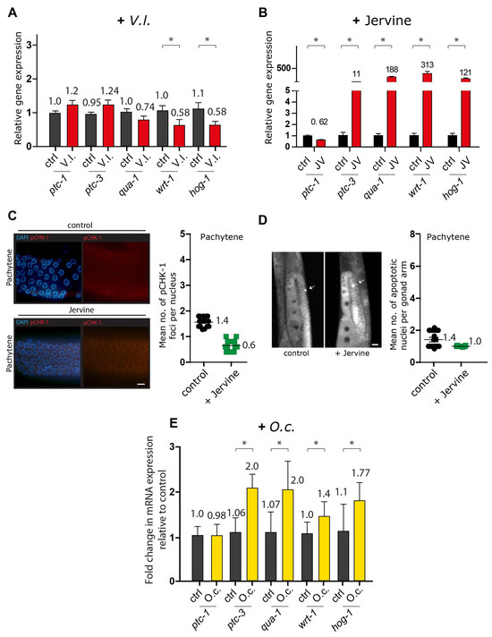 mRNA expression profiles and effects of herbal extracts on DNA damage checkpoint activation, apoptosis, and hedgehog pathway components. (A) mRNA expression profile of hedgehog signaling components in C. elegans treated with V. lobelianum extract. wrt-1 and hog-1 were significantly downregulated. (B) Upregulation of the hedgehog signaling pathway when jervine was used alone. (C) Jervine extract did not increase the number of pCHK-1 foci (1.4 vs. 0.6 in control and +jervine, p < 0.0001). Bar = 2 µm. (D) V. lobelianum extract did not induce apoptosis (1.4 vs. 1.0 in control and +jervine, p = 0.1077). Bar = 20 µm. (E) O. cornuta extract led to the upregulation of the hedgehog pathway components wrt-1, hog-1, ptc-3, and qua-1, distinct from V.l. extract. V.I. and O.c. were added to a final concentration of 0.03 μg/mL. The concentration of Jervine was 20 μM. Asterisks indicate statistical significance according to the two-tailed Mann–Whitney test.