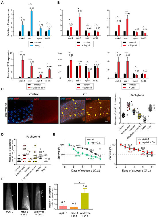 MAPK pathway activation and its role in response to O. Cornuta treatment. (A) Induction of the MAPK pathway components mek-2 and sos-1 upon O. cornuta treatment. mek-2 expression increased by 2.53-fold (p = 0.0006), and sos-1 expression increased by 6.86-fold (p = 0.0002) compared to the control. Additionally, mpk-1 and let-60 expression was induced by 1.74-fold (p = 0.0003) and 1.43-fold (p = 0.0003), respectively. Asterisks indicate statistical significance according to the two-tailed Mann–Whitney test. (B) Activation of the MAPK pathway by individual compounds in O. cornuta. For instance, sugiol treatment increased mek-2 expression by 1.7-fold (p = 0.0002) and sos-1 expression by 3.65-fold (p = 0.0002). Thymol treatment resulted in a 2.54-fold increase in mek-2 expression (p = 0.0009) and a 4.0-fold increase in sos-1 expression (p = 0.0009). Intriguingly, linoleic acid induced all four MAPK components, while other compounds induced one or two genes. Various O. cornuta compounds (sugiol, thymol, linoleic acid, luteolin, and DHT) altered MAPK pathway expression. DHT, dihydrotanshinone. (C) Linoleic acid-induced DNA damage checkpoint activation. Increased pCHK-1 foci during the pachytene stage (p < 0.0001). Arrows indicate pCHK-1 foci. Asterisks indicate statistical significance against the control group. Bar = 2 µm. (D) Linoleic acid-triggered apoptosis in germline nuclei similar to O. cornuta treatment (p < 0.0001). Other O. cornuta compounds did not show a simultaneous increase in both pCHK-1 foci and apoptosis. Asterisks indicate statistical significance against the control group. (E) The role of the MAPK pathway in the O. cornuta response validated by the mpk-1(ga111) mutant strain. Reduced survivability was reversed in the mutant (p = 0.4256 on day 5, p = 0.4208 on day 10 by the two-tailed t-test). Relative survivability is presented. Asterisks indicate statistical significance against the control group. (F) Suppressed apoptosis in the mpk-1 (ga111) mutant, supporting MAPK-dependent DNA damage pathway activation and survivability (p = 0.0173 in mpk-1 +O.c. and wild type +O.c.). Thymol (2 mM), dihydrotanshinone I (5 μM), luteolin (20 μM), linoleic acid (0.3 μM), and sugiol (10 μM) were employed in a qPCR study. O.c. extracts were introduced at a final concentration of 0.03 μg/mL Please refer to the Section 4 for details. Arrows indicate nuclei undergoing apoptosis. Asterisks indicate statistical significance against the control group. Bar = 20 µm.